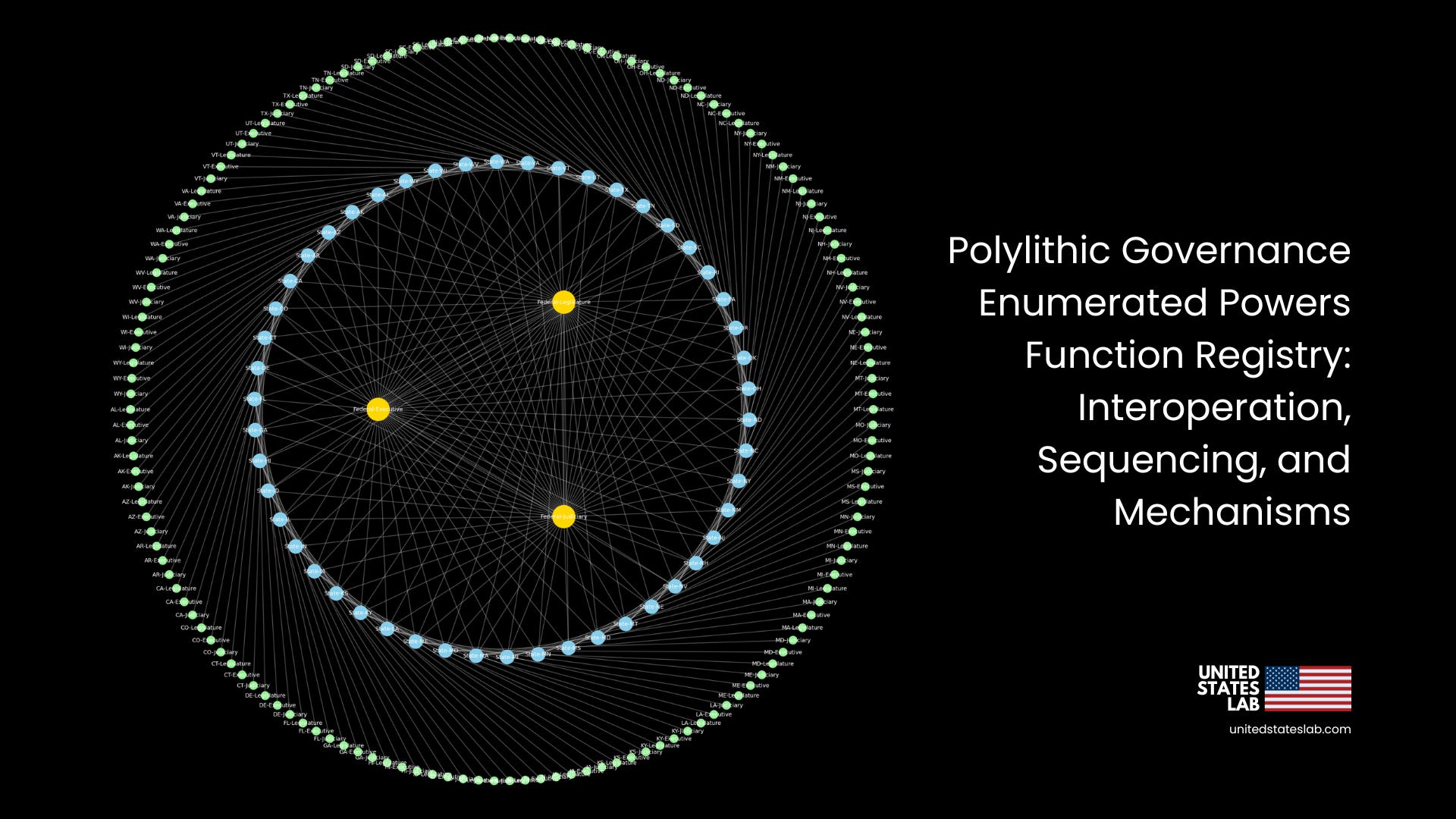 By encoding every constitutional function as a verifiable execution path, United States Lab’s Polylithic Governance Function Registry creates more than a technical model, it provides a durable, enforceable means of carrying forward the Madisonian experiment. Each validator set, each federated state replica, and each guardian action is bound to proofs, constraints, and timing windows that preserve the original structure of the Union while adapting it to a world where verification can be instantaneous and tamper-proof.